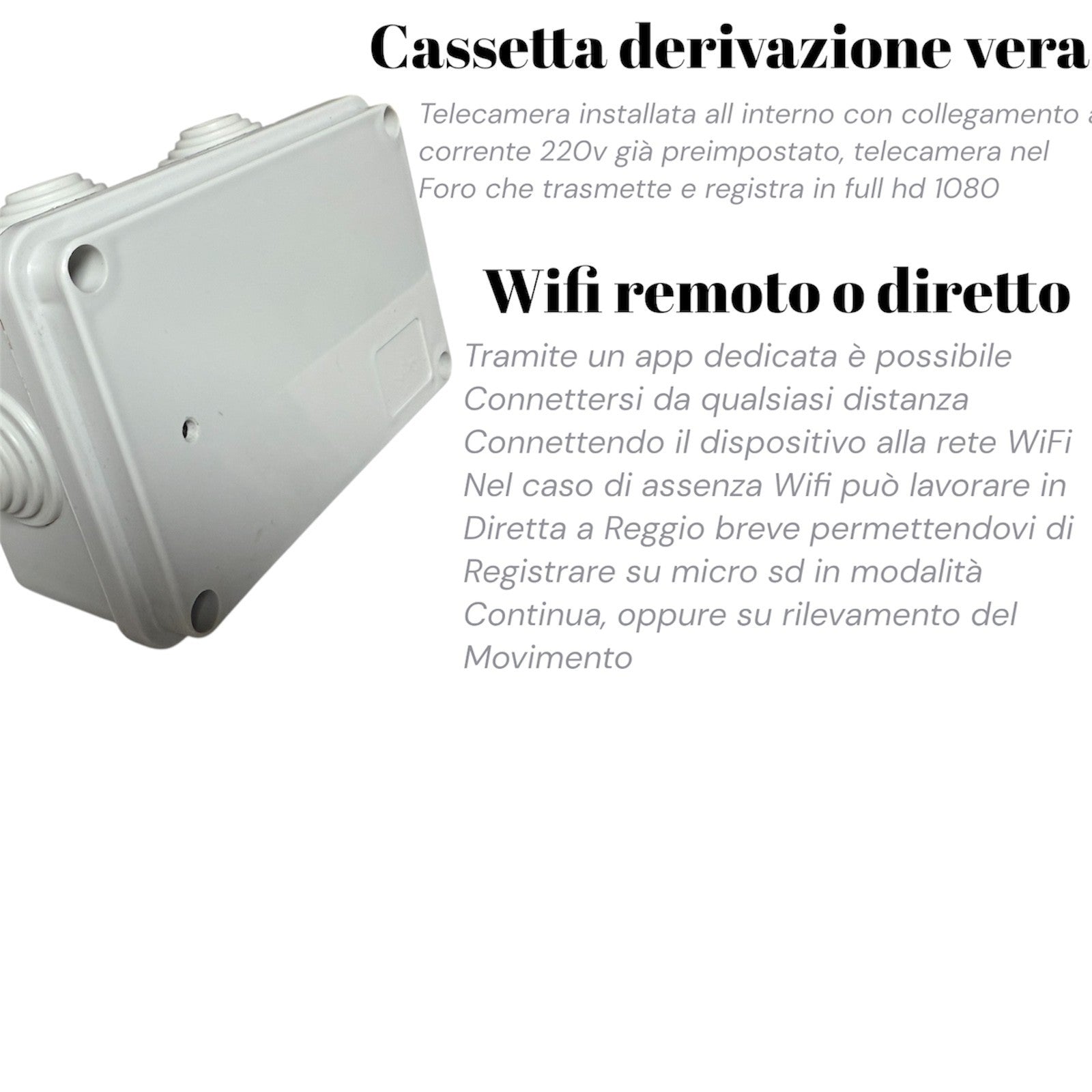 All’interno della scatola di derivazione è integrata una micro-telecamera Full HD con connessione Wi-Fi, capace di trasmettere video in tempo reale su smartphone tramite app dedicata. Perfetta per officine, magazzini, garage, cantieri, box auto, abitazioni e locali tecnici.