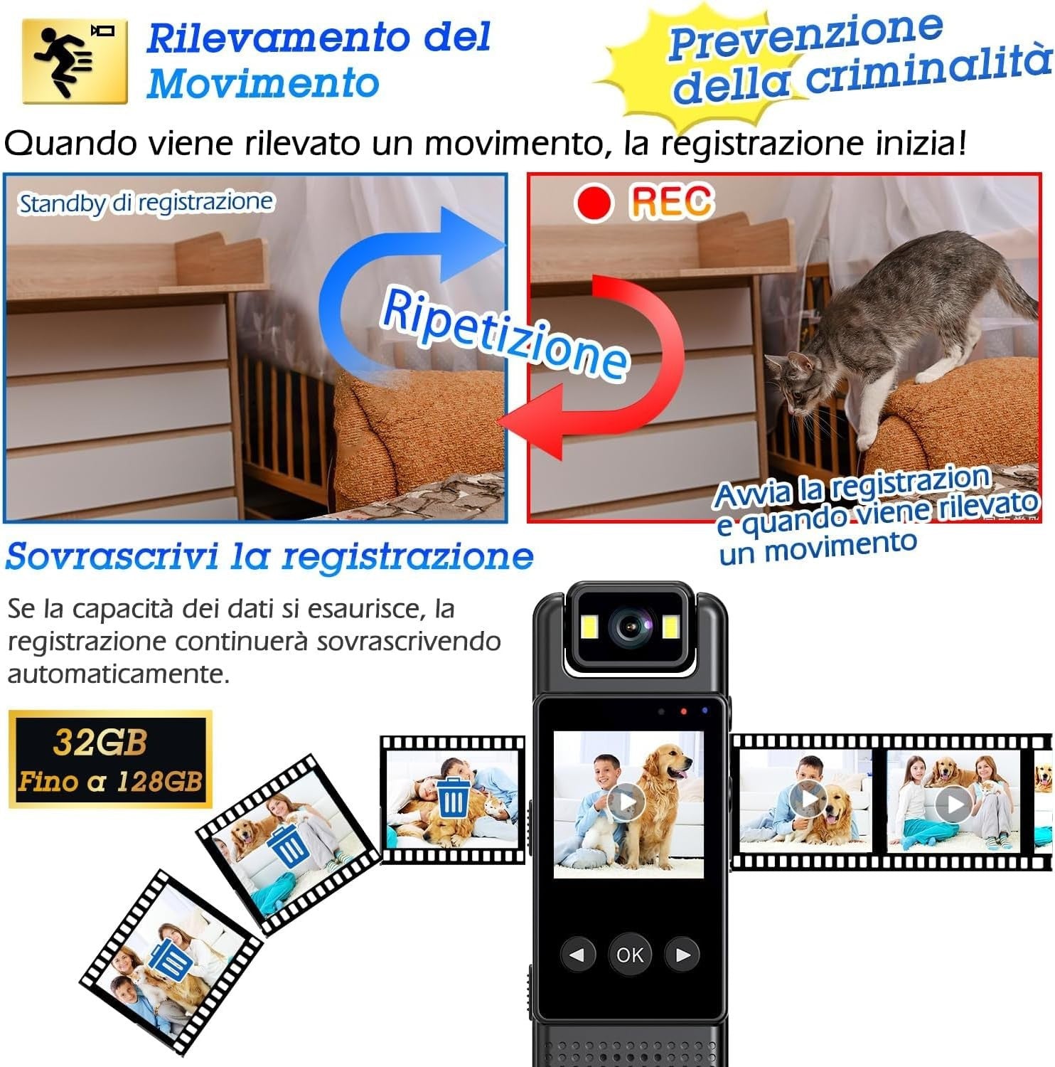 Bodycam 1080P HD – Visione Notturna, Rilevazione Movimento, Portatile e Multiuso